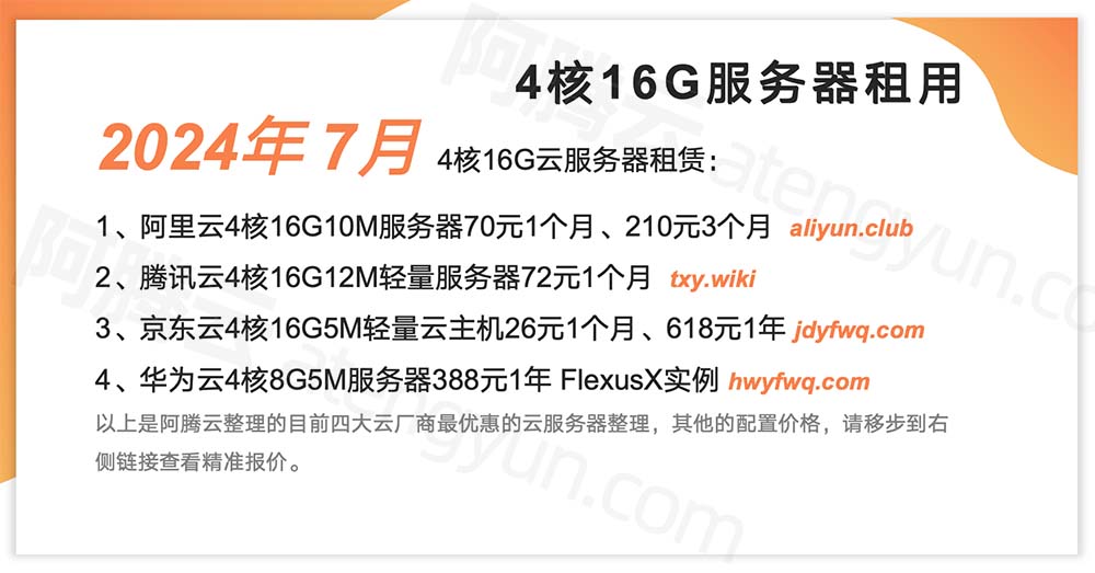2024年7月最新4核16G云服务器租用优惠价格表,阿里云4核16G服务器10M带宽70元1个月,腾讯云轻量应用服务器4核16G12M带宽72元一个月,京东云4核16G轻量云主机5M带宽26.5元一个月,服务器优惠网整理最新4核16G服务器租赁优惠价格表: