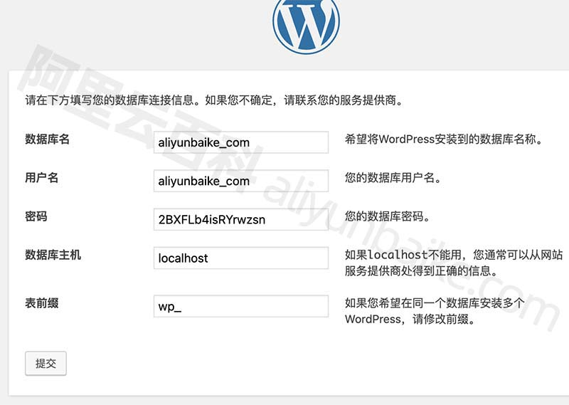 如上图,点击现在就开始!填写数据库名、数据库用户名和密码信息,如下图: